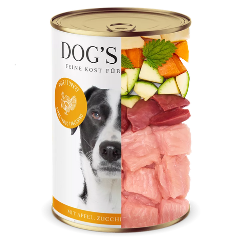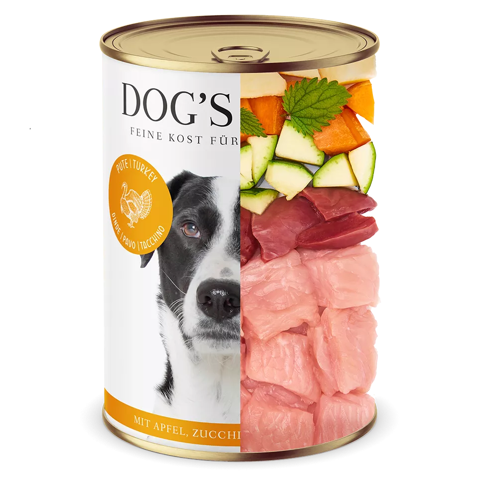 Pavo 55 % (carne 30 %, corazón 17 %, hígado 8 %), calabacines 15 %, zanahorias 12 %, manzanas 10 %, fécula de patata, minerales, aceite de nuez 0,9 %, cáscara de huevo molida, algas marinas, sílice, hojas de diente de león, hojas de ortiga, flores de caléndula, berro de agua.